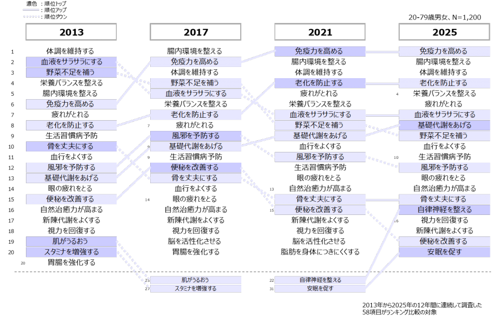 さらに、「老化を防止する」は2013年8位から2025年は4位に、