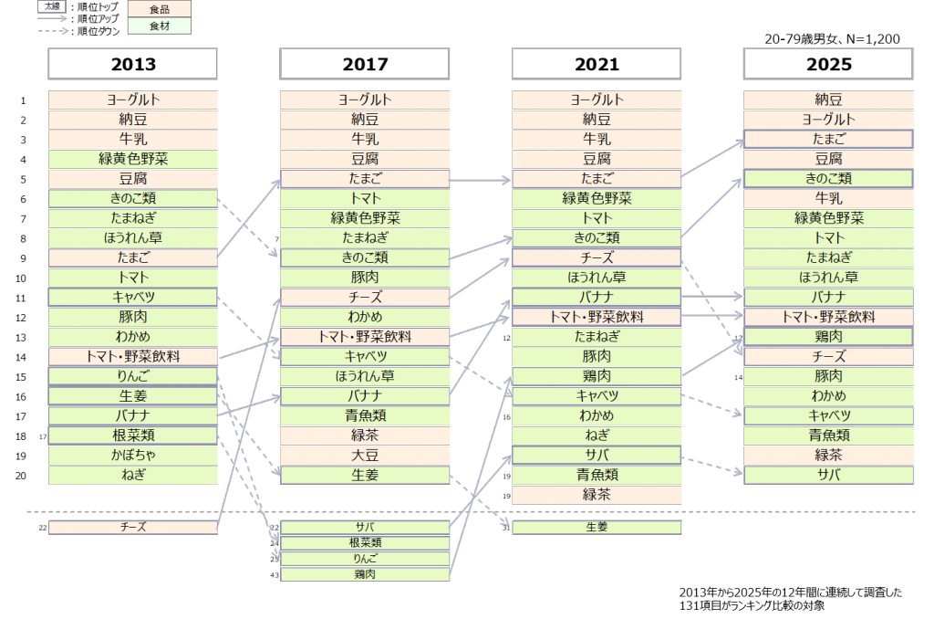 2013年以降、トップ「ヨーグルト」、トップ2「納豆」が長く続いてきましたが、2025年は「納豆」が「ヨーグルト」を抜き、初めてトップに立ちました。