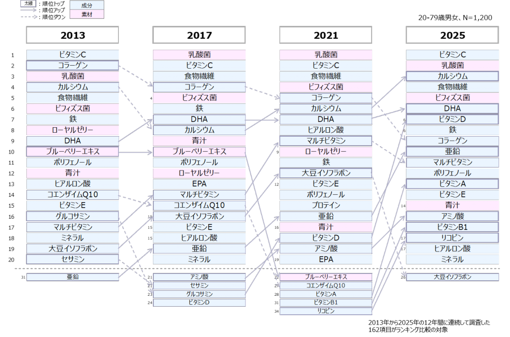 「コラーゲン」「コエンザイムQ10」「ブルーベリーエキス」「グルコサミン」「セサミン」は長期的に順位を落としています。